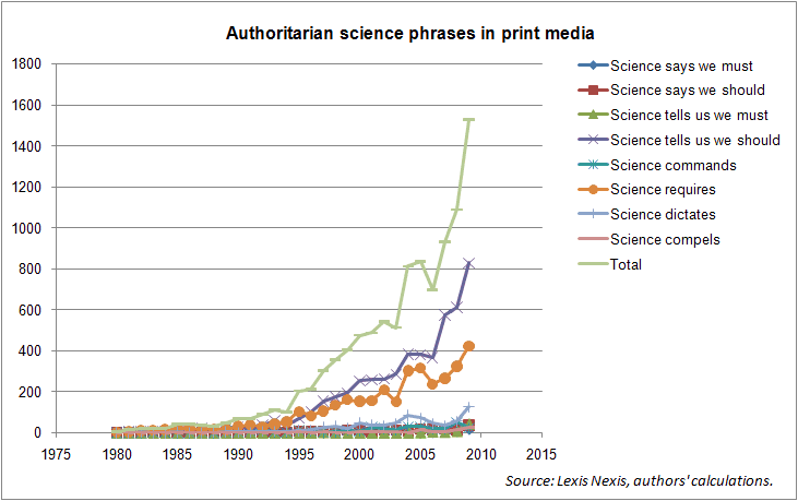 Well, then.  Science, back in a golden age before the politicization of research when scientists were men and women liked them that way, pronouncements from "science" were descriptive, not proscriptive.  "We found this to be true."  Not, "Do this or that."  The authors of this article decided to check up on things.  Looking at Lexis-Nexis, they searched for occurrences of phrases like, “science says we must,” “science says we should,” “science tells us we must,” “science tells us we should,” “science commands,” “science requires,” “science dictates,” and “science compels.”