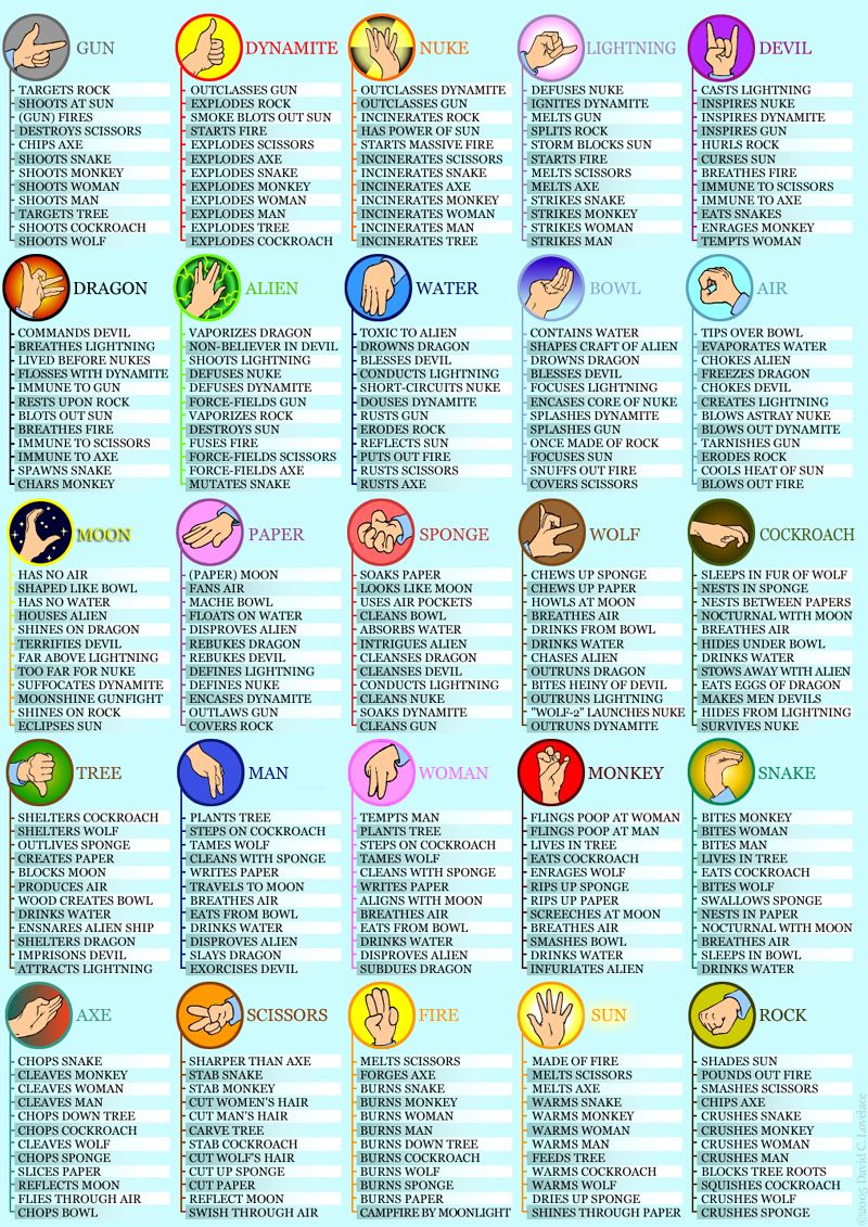 The advantage here is that ties are almost never going to happen. The disadvantage is memorizing 25 hand gestures and their 300 possible outcomes. A sample of the madness: image